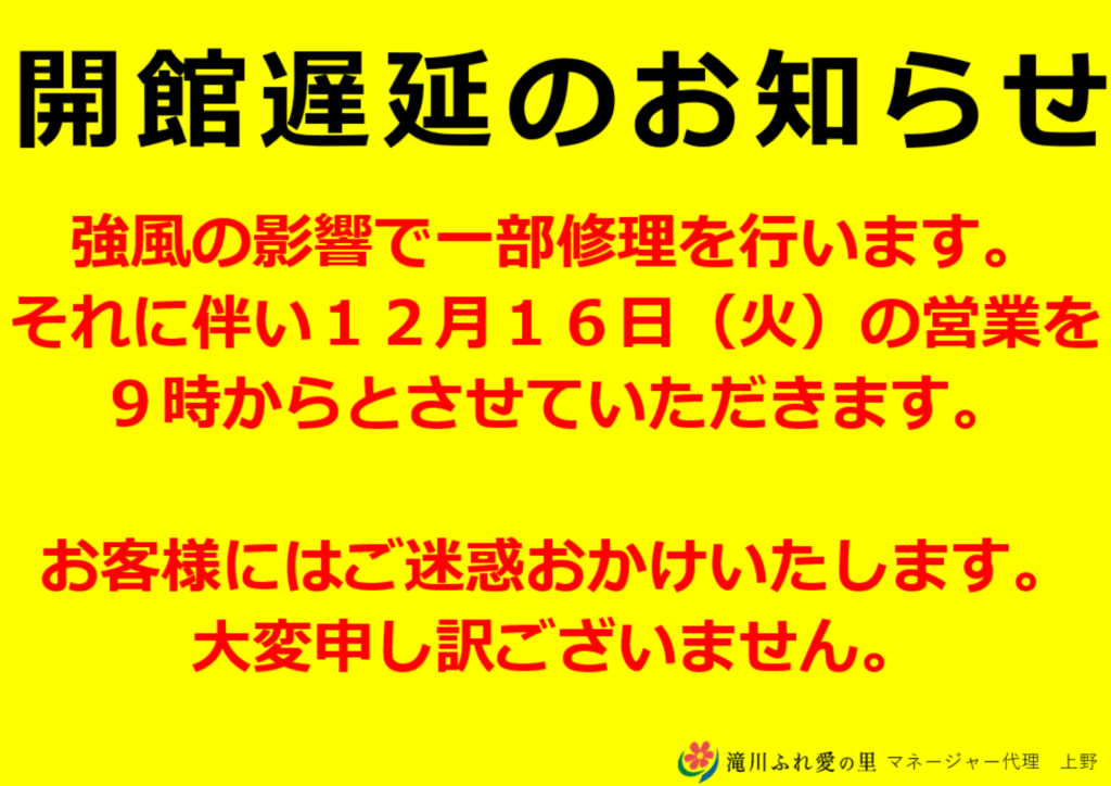 12月16日(火)の営業時間を1時間変更させていただきます。