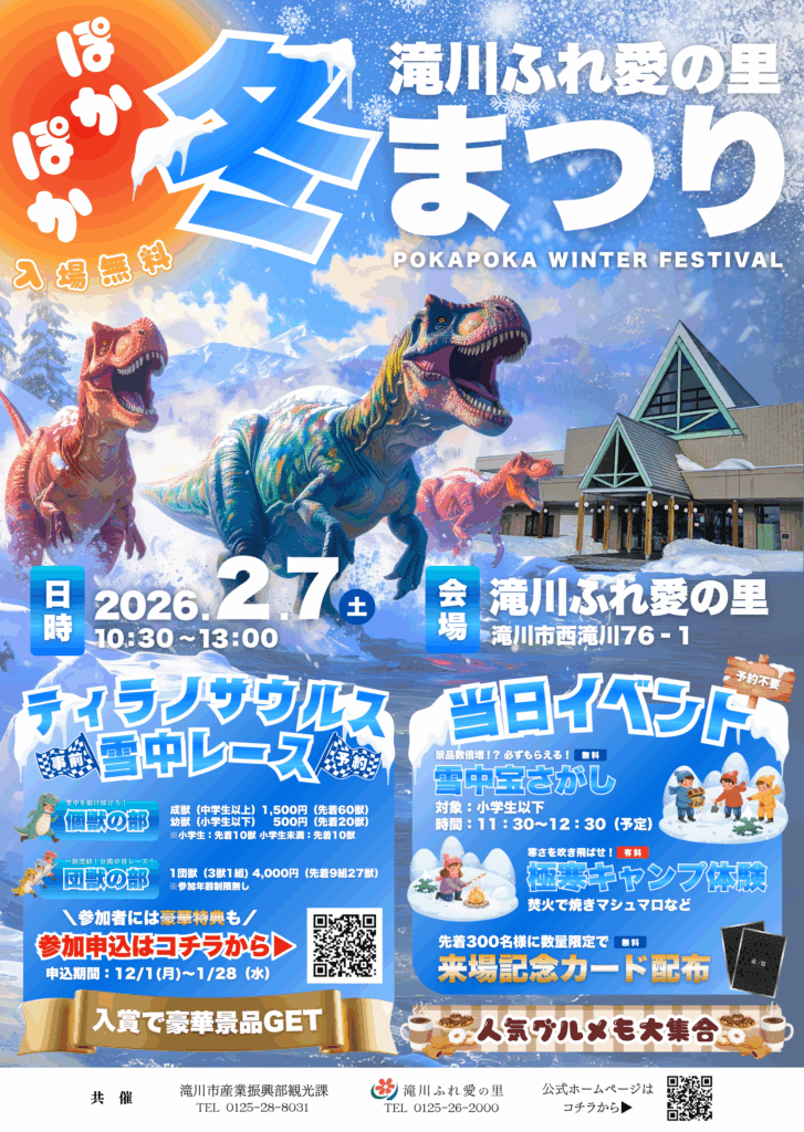 2026年2月7日(土)、今回3回目となるティラノサウルス雪中レースのほか、小学生以下を対象にした「雪中宝探し」や、寒さを吹き飛ばす「極寒キャンプ体験」を開催します。